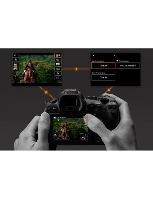 La pantalla táctil LCD trasera de 3,0" y 1,62 m puntos cuenta con un diseño de ángulo variable que beneficia la grabación frontal, como para las necesidades de vlogging, así como para trabajar desde ángulos de disparo altos y bajos.