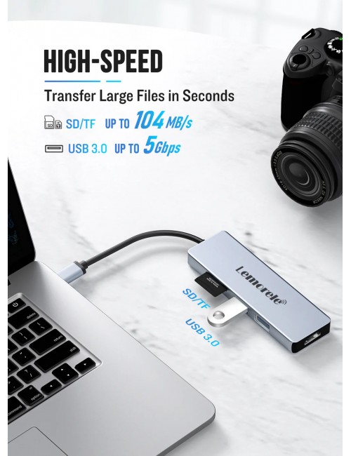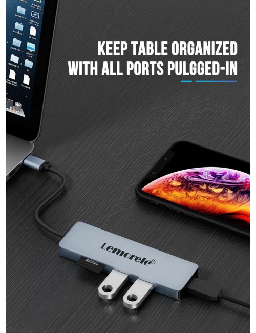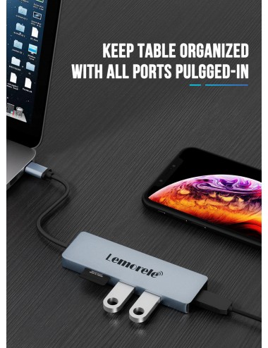 El Lemorele TC18 es un adaptador multifunción que combina cinco puertos esenciales en un diseño compacto, elegante y eficiente. Perfecto para usuarios de MacBook, iPad Pro y laptops USB-C, este hub permite expandir la conectividad sin sacrificar espacio ni rendimiento.