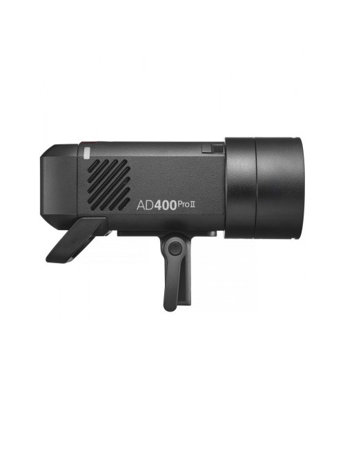 Esta versión II mejora al AD400Pro original añadiendo indicador de color por grupo, una pantalla a color de 2,4" para control local y una lámpara de modelado LED bicolor de 30 W más potente. El diseño compacto (aprox. 21,1 x 12,9 x 9 cm) y el peso de unos 2 kg con batería lo hacen muy portátil para sesiones en locación.