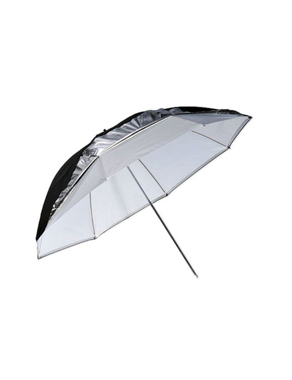 Paraguas que combina dos capas, una interior cosida traslúcida y una exterior plateada por dentro u negra por fuera. La exterior es reversible.