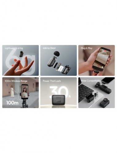 El Ulanzi A200 redefine la portabilidad en el audio profesional. Con un peso de apenas 6 gramos, este micrófono inalámbrico ofrece una calidad de sonido de estudio (48kHz/24bit) en un cuerpo del tamaño de la punta de un dedo. Es la solución perfecta para vlogging, entrevistas y transmisiones en vivo que requieren discreción y claridad cristalina.