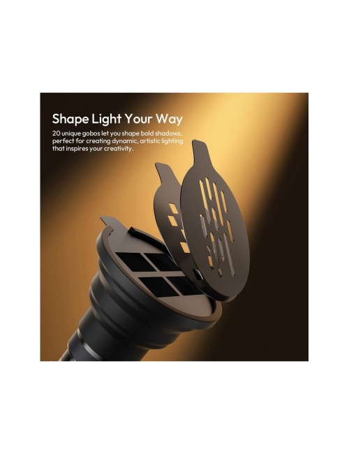 Dato Creativo: Utiliza el tubo de silicona plegable junto con los gobos incluidos para crear texturas de "persiana", "ventanas" o "figuras geométricas" en tus retratos o fotografía de producto.