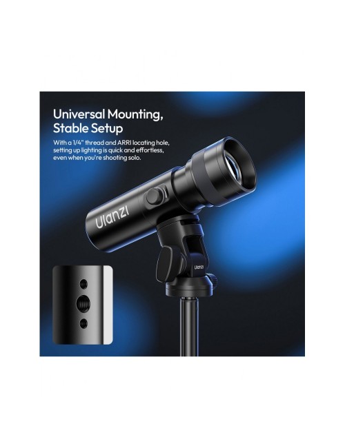 La Ulanzi LM01 es una linterna LED compacta y potente diseñada específicamente para aplicaciones creativas de fotografía y video. A diferencia de una linterna convencional, la LM01 permite proyectar efectos visuales complejos, ajustar colores y controlar el enfoque de la luz, convirtiéndose en un "spotlight" portátil esencial para iluminar escenas con estilo y precisión.