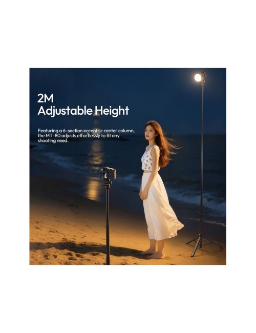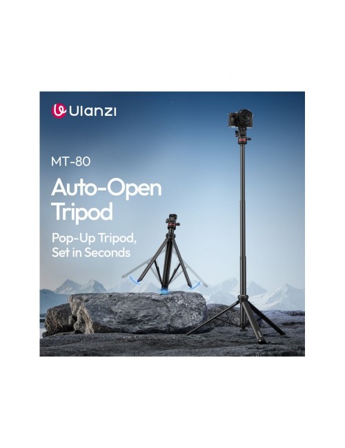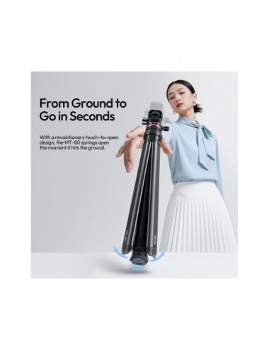 Configura tu equipo en un abrir y cerrar de ojos con el Trípode MT-80 de Ulanzi. Este innovador soporte cuenta con un diseño de base "touch-to-open" (toque para abrir) que despliega las patas automáticamente al entrar en contacto con el suelo, ahorrándote tiempo valioso en cada sesión.
