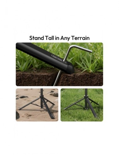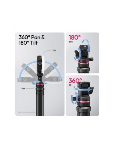 El cabezal de 2 vías ofrece un control total con una inclinación (tilt) de 180° y un paneo de 360°, asegurando el encuadre perfecto. Además, para situaciones de viento o terrenos irregulares, el trípode posee una base ancha reforzada y orificios en las patas diseñados para insertar estacas de estabilización.