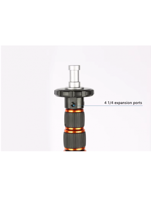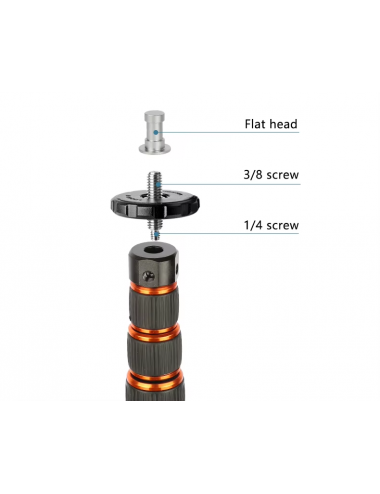 Base / tornillo superior intercambiable puedes usar 3 configuraciones: perno de 3/8, perno de 1/4 (para poner directamente una cámara por ejemplo) o Espiga para usar conjuntamente con cabezales de iluminación